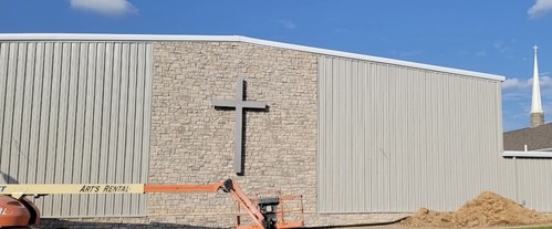 The builders added a beautiful piece to the exterior of the new build this week. At the cross, at the cross, where I first saw the light and the burden of my heart rolled away. It was there by faith, I received my sight and now I am happy all the day.